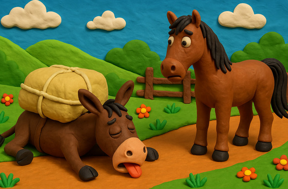 Un asno y un caballo vivían juntos desde su más tierna infancia y, como buenos amigos que eran, utilizaban el mismo establo, compartían la bandeja de heno, y se repartían el trabajo equitativamente. Su dueño era molinero, así que su tarea diaria consistía en transportar la harina de trigo desde el campo al mercado principal de la ciudad.